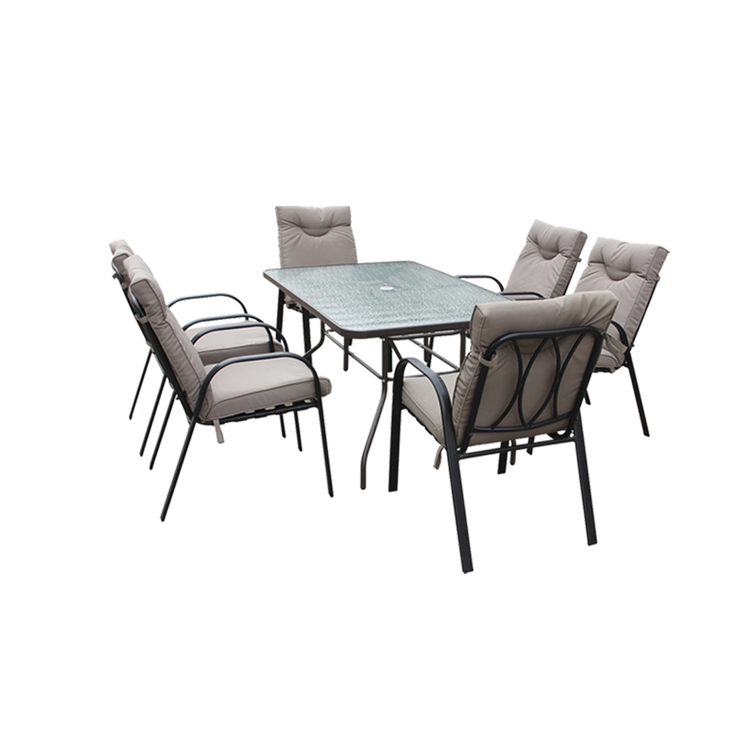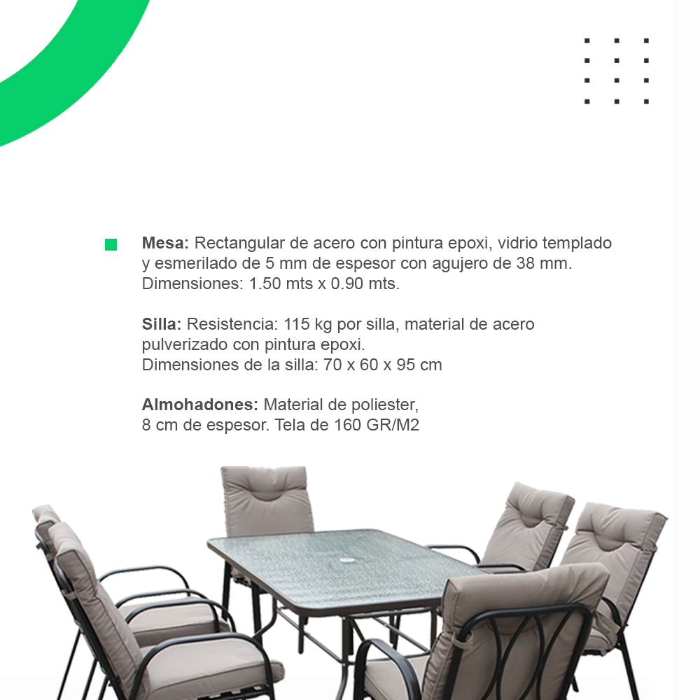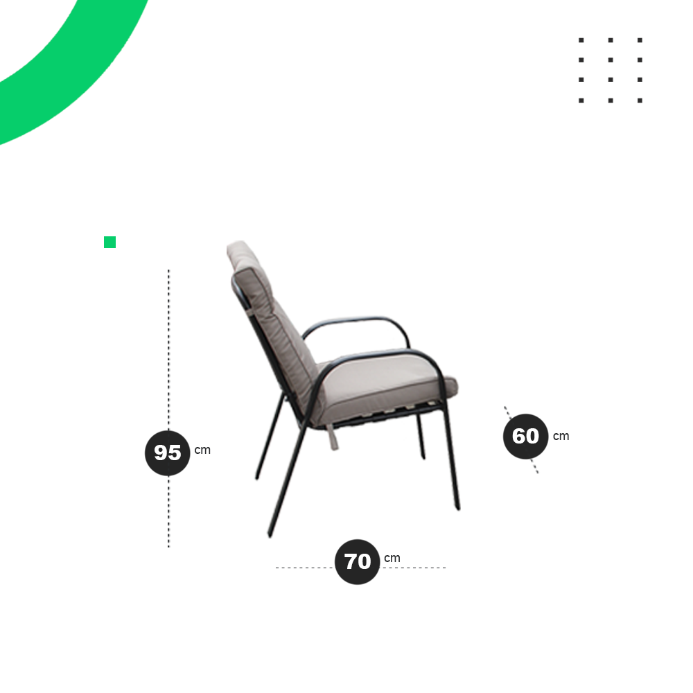 Silla: Resistencia: 115 kg por silla, material de acero pulverizado con pintura epoxi. Dimensiones de la silla: 70 x 60 x 95 cm Almohadones: Material de poliester, 8 cm de espesor. Tela de 160 GR/M2