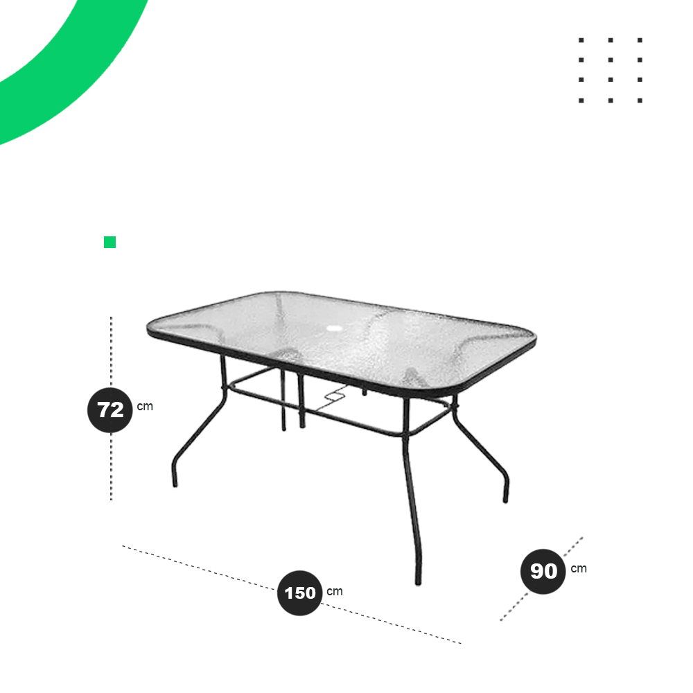 Mesa: Rectangular de acero con pintura epoxi, vidrio templado y esmerilado de 5 mm de espesor con agujero de 38 mm. Dimensiones: 1.50 mts x 0.90 mts