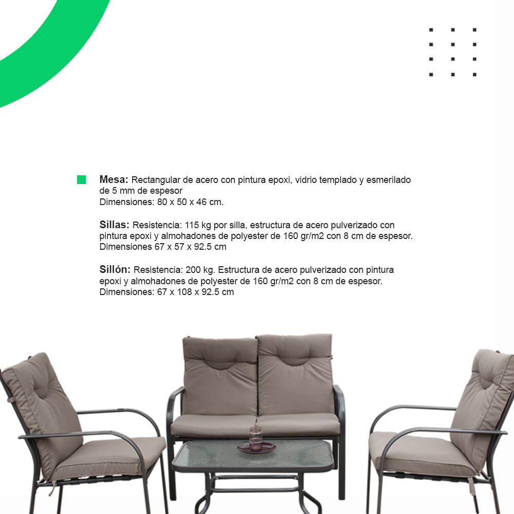 Sillas: Resistencia: 115 kg por silla, estructura de acero pulverizado con pintura epoxi y almohadones de polyester de 160 gr/m2 con 8 cm de espesor. Dimensiones 67 x 57 x 92.5 cm
