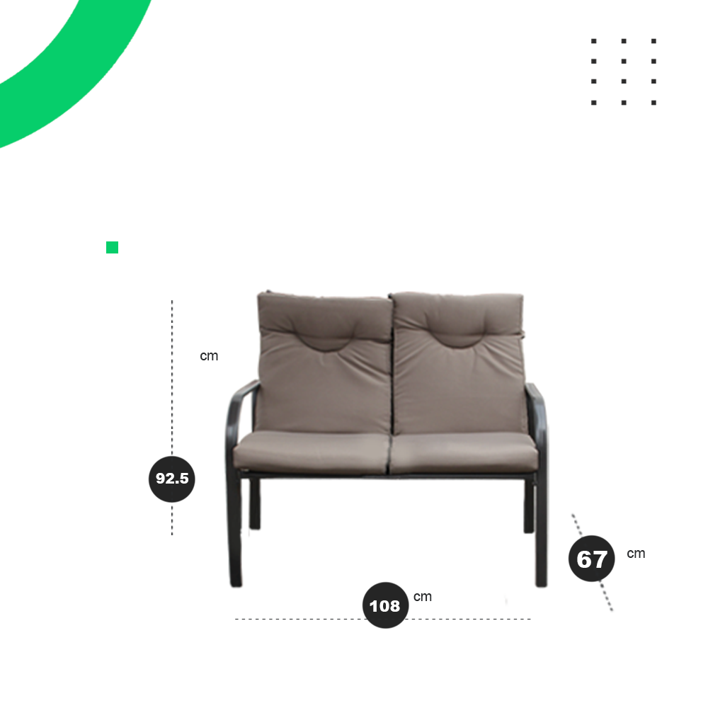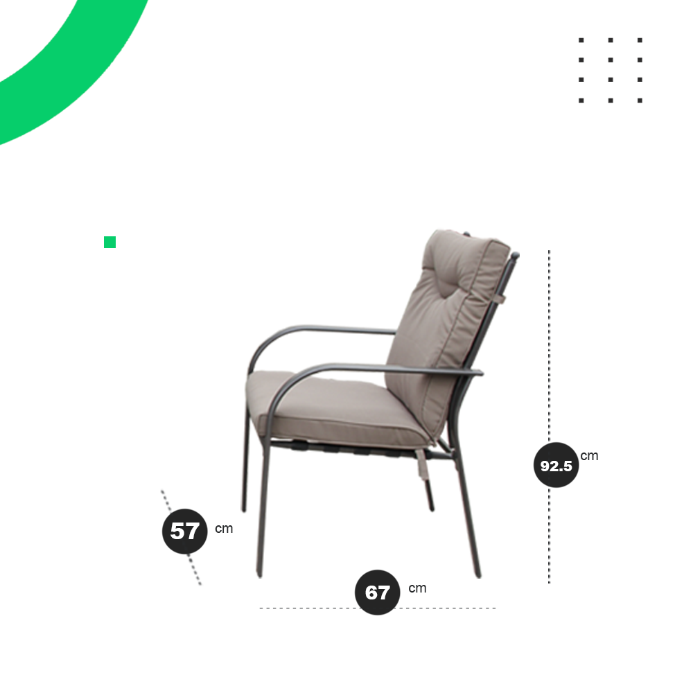 Sillón: Resistencia: 200 kg. Estructura de acero pulverizado con pintura epoxi y almohadones de polyester de 160 gr/m2 con 8 cm de espesor. Dimensiones: 67 x 108 x 92.5 cm
