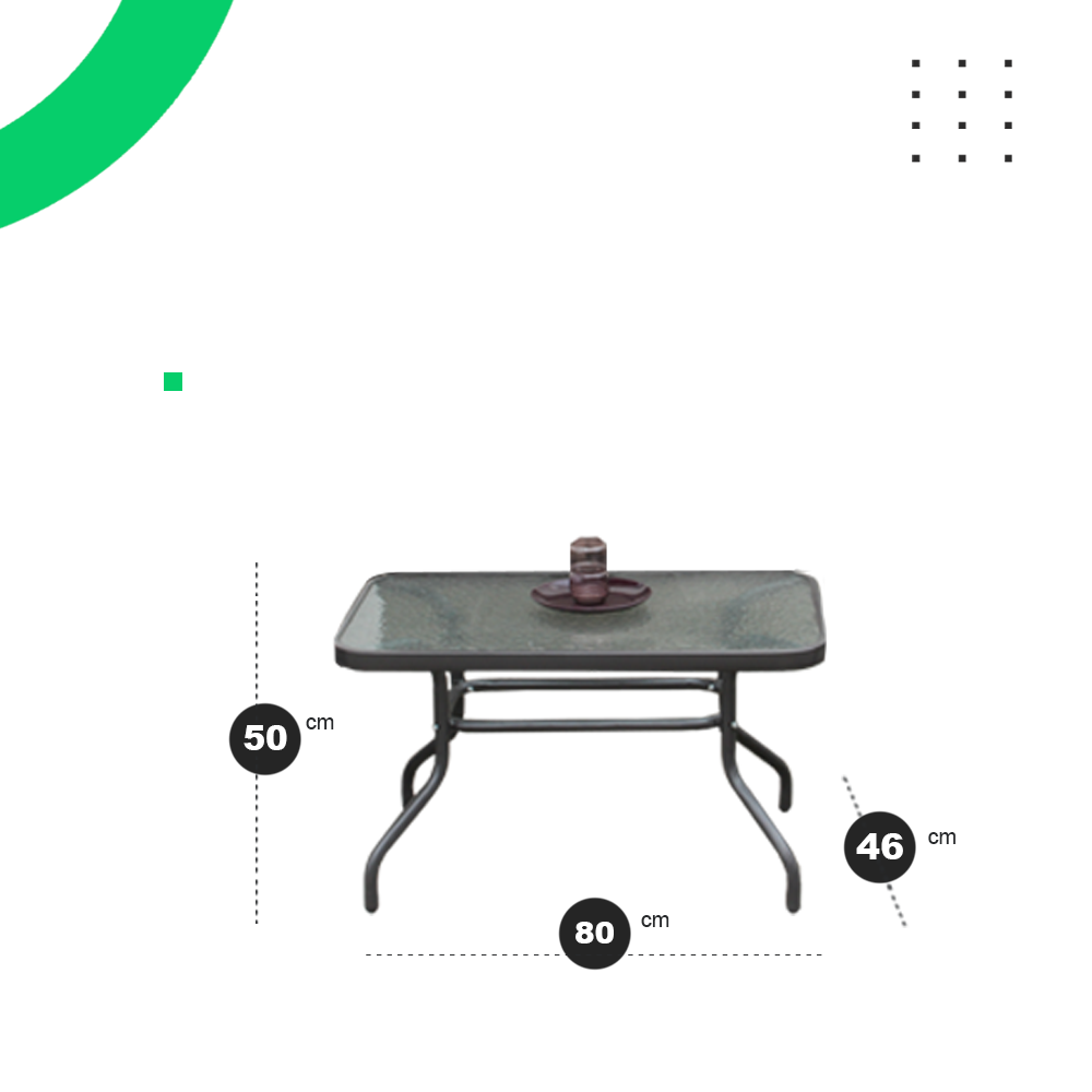 Mesa: Rectangular de acero con pintura epoxi, vidrio templado y esmerilado de 5 mm de espesor Dimensiones: 80 x 50 x 46 cm.